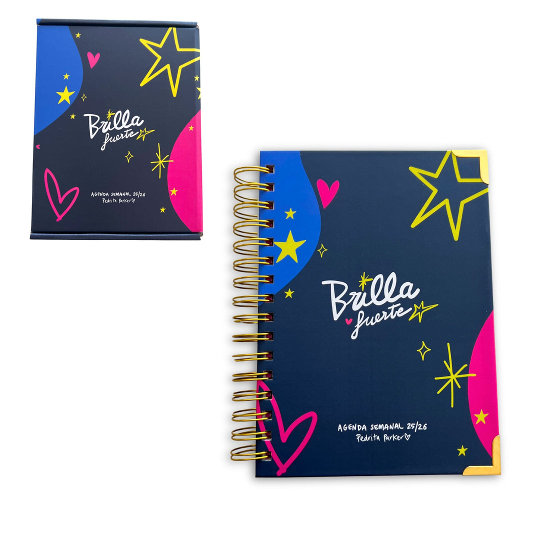 Esquinas metálicas doradas y goma elástica súper reforzada de cierre en la parte inferior, encuadernación robusta con wire-o dorado, separadores plastificados, notas adhesivas, un montón de pegatinas, bolsillo doble y goma para el boli.