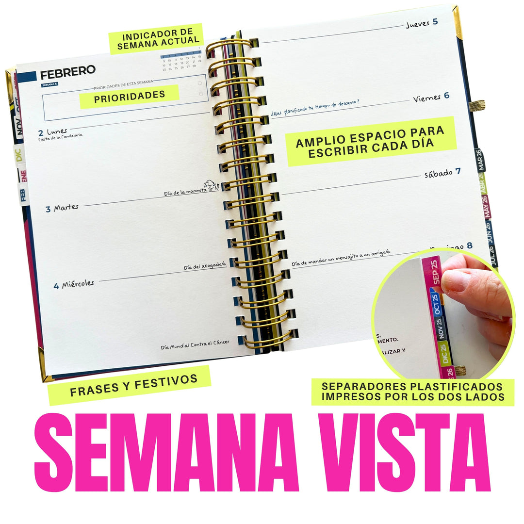En esta agenda antes de cada mes puedes encontrar un planing mensual, que incluye el calendario lunar, zona de puntos para notas del mes y mini calendario de mes anterior y siguiente. Y además trae las pestañas de los meses plastificadas para que no se estropeen con el uso.